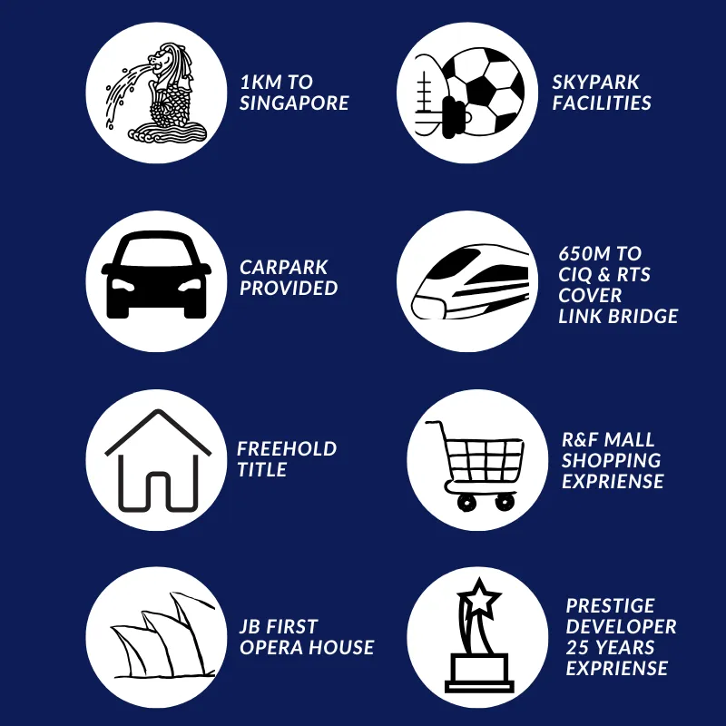 Located on the opposite of Singapore and in the CBD of Johor Bahru, second Largest City in Malaysia. It is only 1056 meters away from Singapore with seamless access to CIQ and the upcoming RTS with a connected link bridge, making it a landmark destination for living and high-return investment in both Singapore and Malaysia.